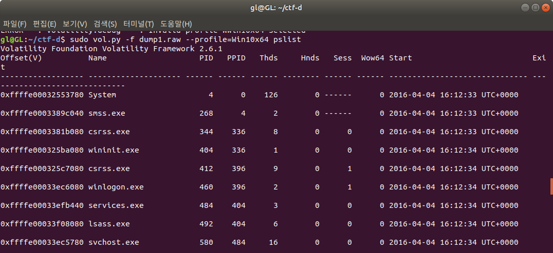 sudo vol.py -f dump1.raw imageinfo를 하면 Win10x64가 나온다.