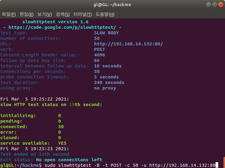 slowhttptest [RUDY공격] [요청 시 사용할 메소드 값] [연결할 개수 설정] [공격 대상 지정]
