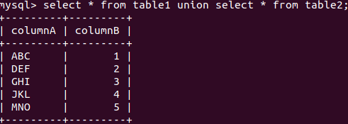 table1 과 table2를 Union을 실행하면 결과를 얻을 수 있다. 단, Union 연산자는 table의 동일한 컬럼의 개수와 데이터타입을 가져야한다 것이다.